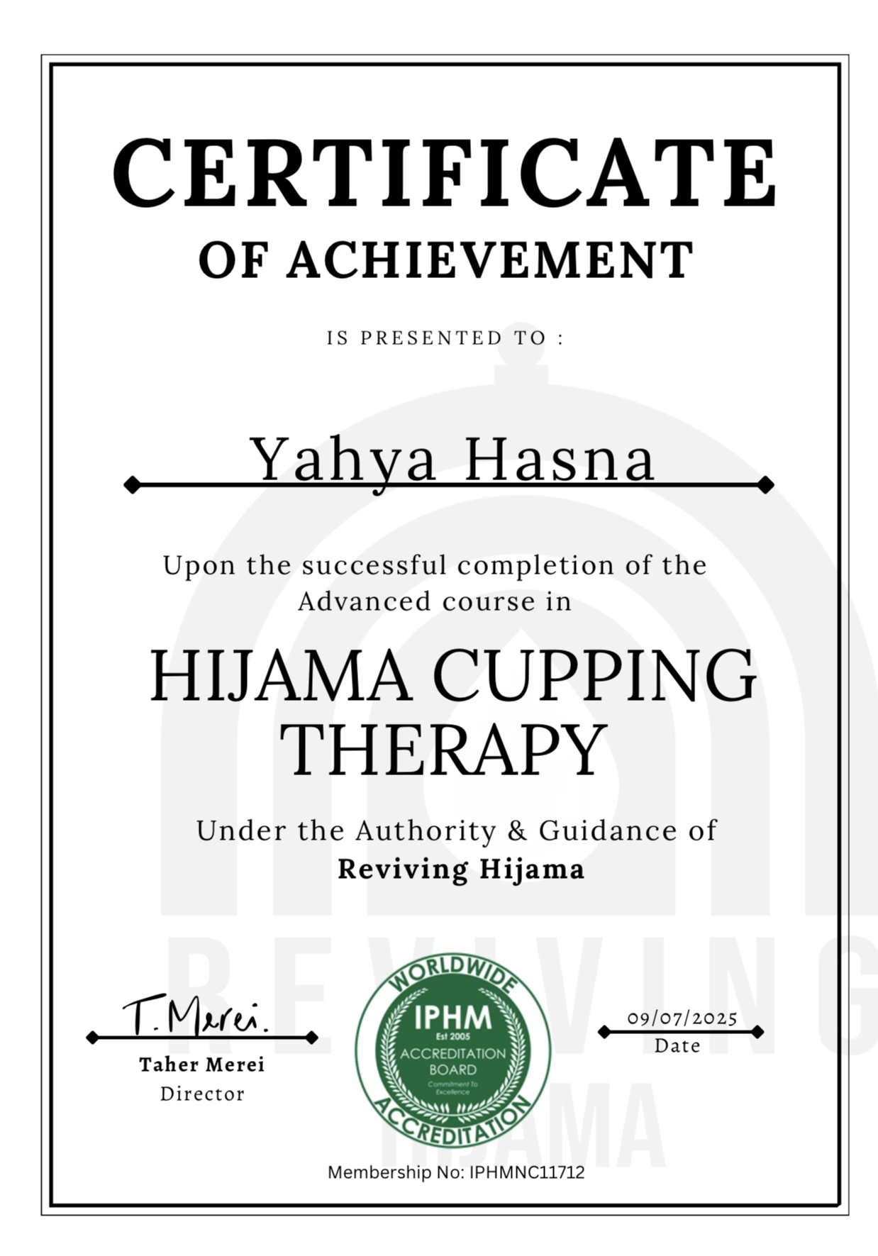 He is a qualified Massage Therapist and holds certificates in Dry Cupping and Wet Cupping (Hijama), following the traditional Islamic practice. He has over five years of experience in the fitness and health field and is trained to work with people of all ages and types of soreness or pain.